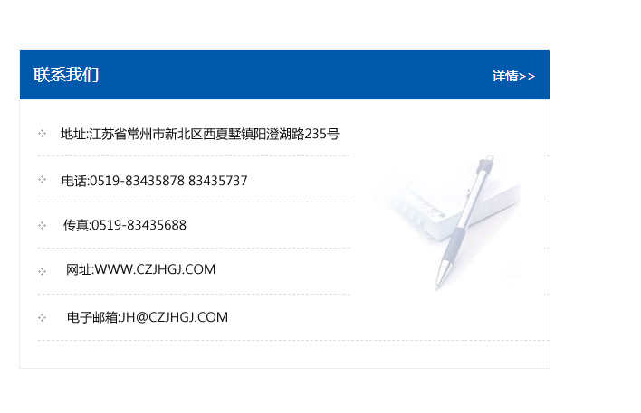 傳真:0519-83435688    郵編:213135    網址:WWW.czjhgj_com.rado-service.com    電子郵箱:JH@czjhgj_com.rado-service.com